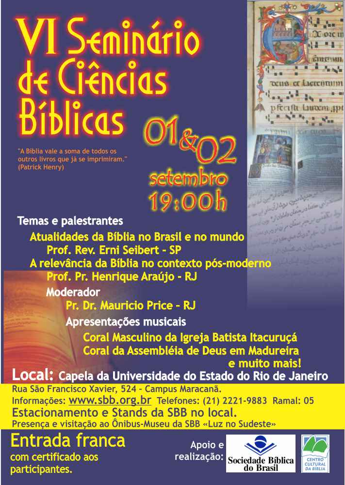 Servindo em favor da Causa da Bíblia, a Sociedade Bíblica do Brasil (SBB) promoverá no Rio de Janeiro (RJ), nos dias 01 e 02 de setembro, mais uma edição do Seminário de Ciências Bíblicas. As palestras serão realizadas na Capela da Universidade do Estado do Rio de Janeiro (UERJ), no Campus Maracanã. A iniciativa tem o objetivo de transmitir às igrejas, lideranças cristãs e a comunidade universitária um pouco do conhecimento envolvido na arte de traduzir a Bíblia Sagrada e difundir os seus ensinamentos a todas as pessoas. Haverá também apresentações musicais dos Coros Masculino da Igreja Batista Itacuruçá e da Assembléia de Deus em Madureira e ainda a presença do Ônibus-Museu ‘’ Luz no Sudeste’’ aberto para exposição ao público.